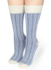 Serenity blue or blush marled baby alpaca yarn is crafted into this color block style with tipped toe, heel and top in natural off-white. Wide ribs and a soft opening finish these socks for optimum comfort.